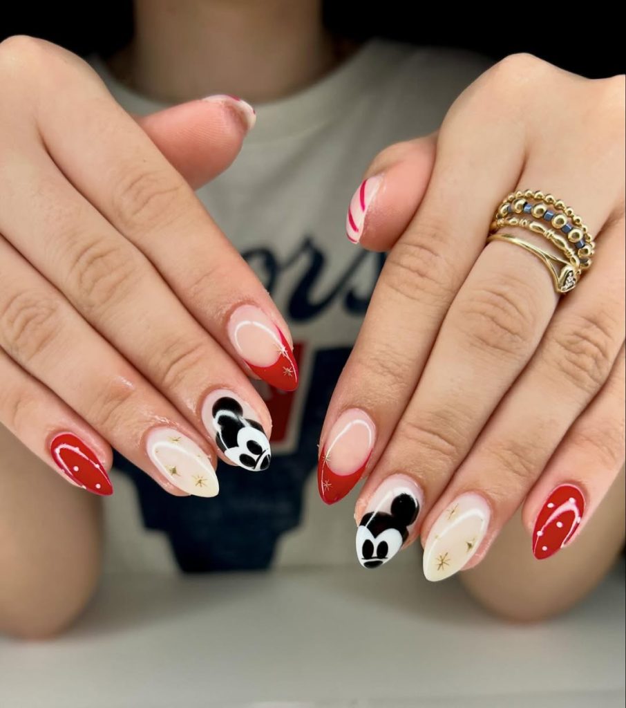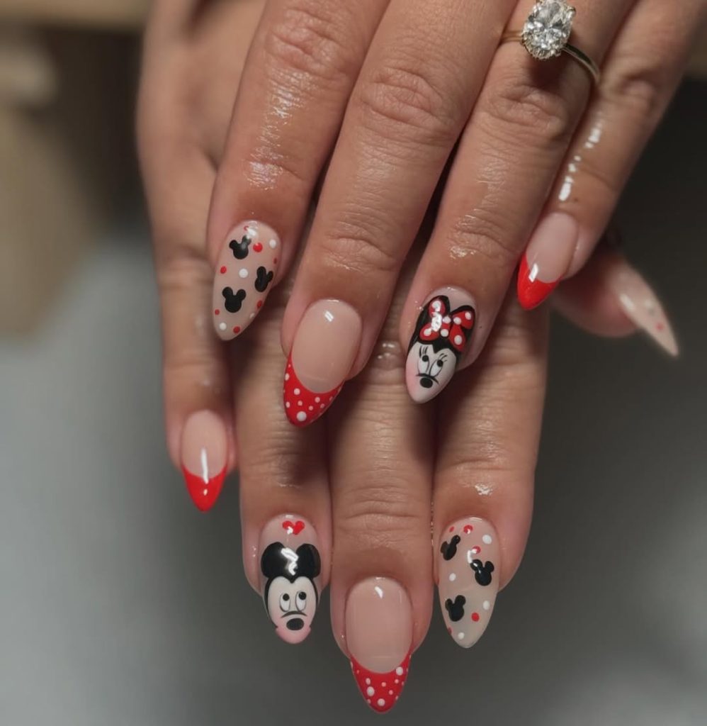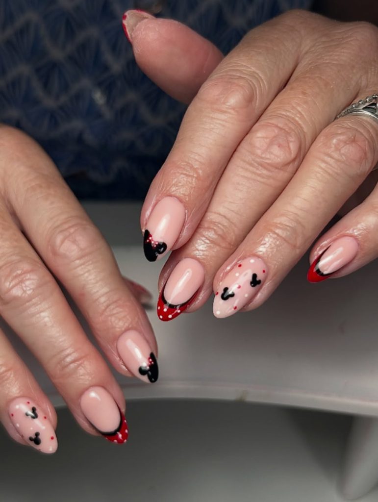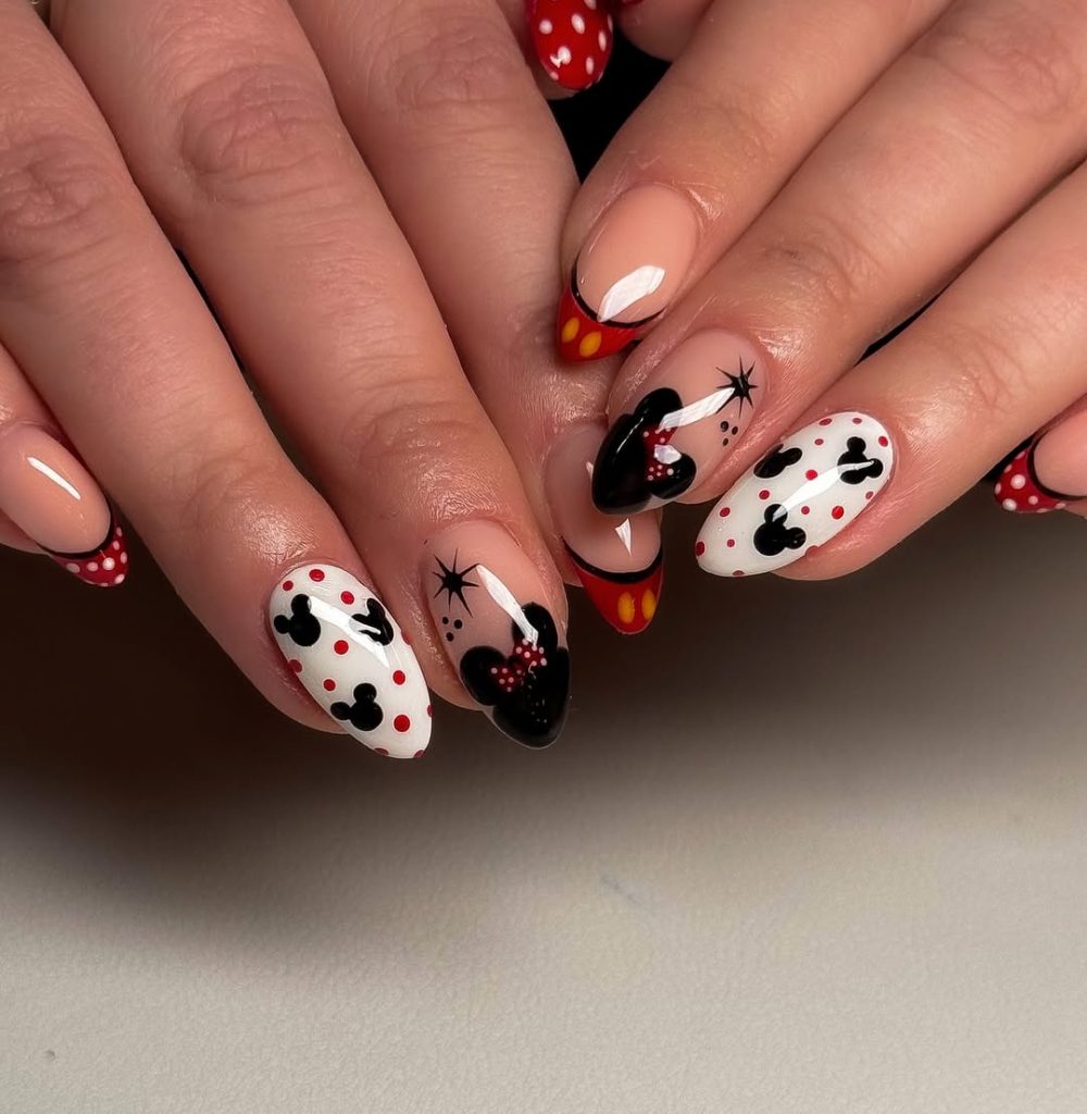 A nude base sets up sharp red-and-black arcs for a playful french tip ; scattered polka dots and micro Mickey silhouettes tie the look together. The medium almond length is universally flattering, and the palette reads instantly Minnie without going literal.