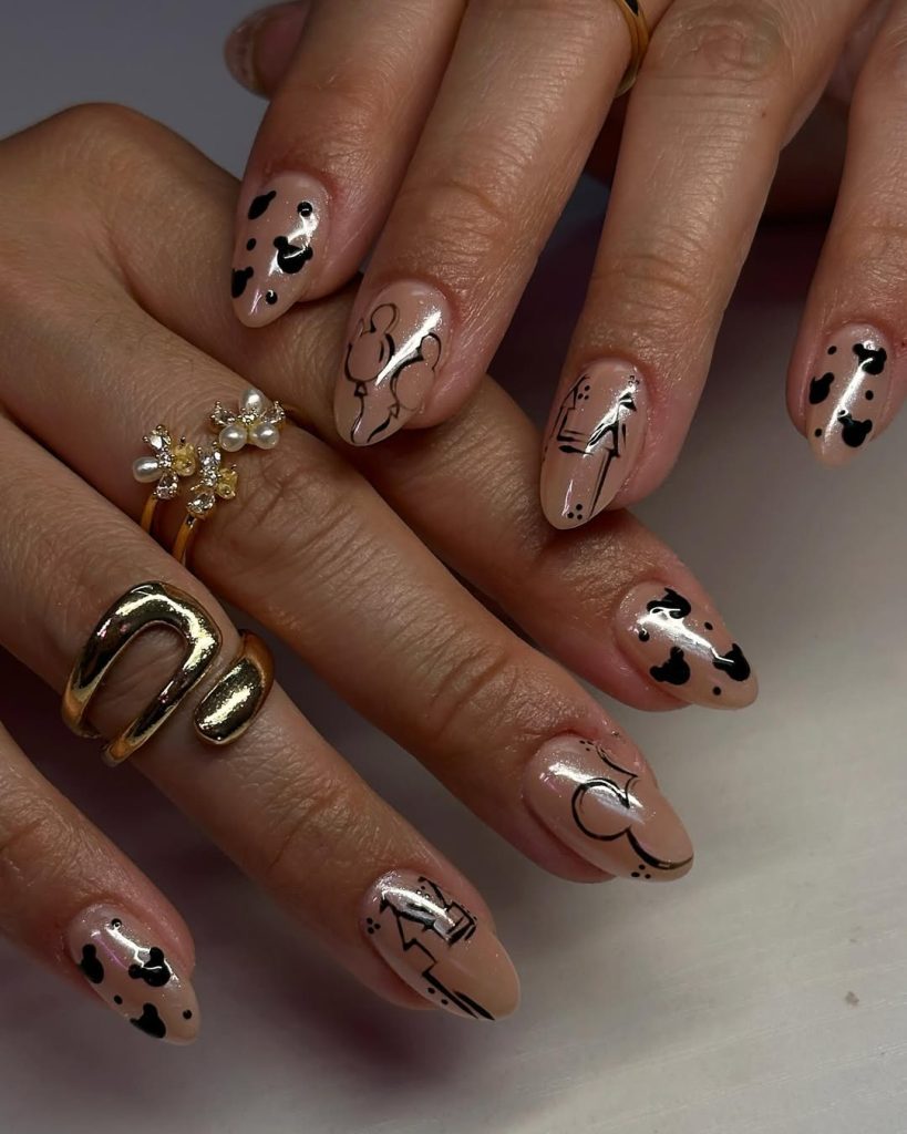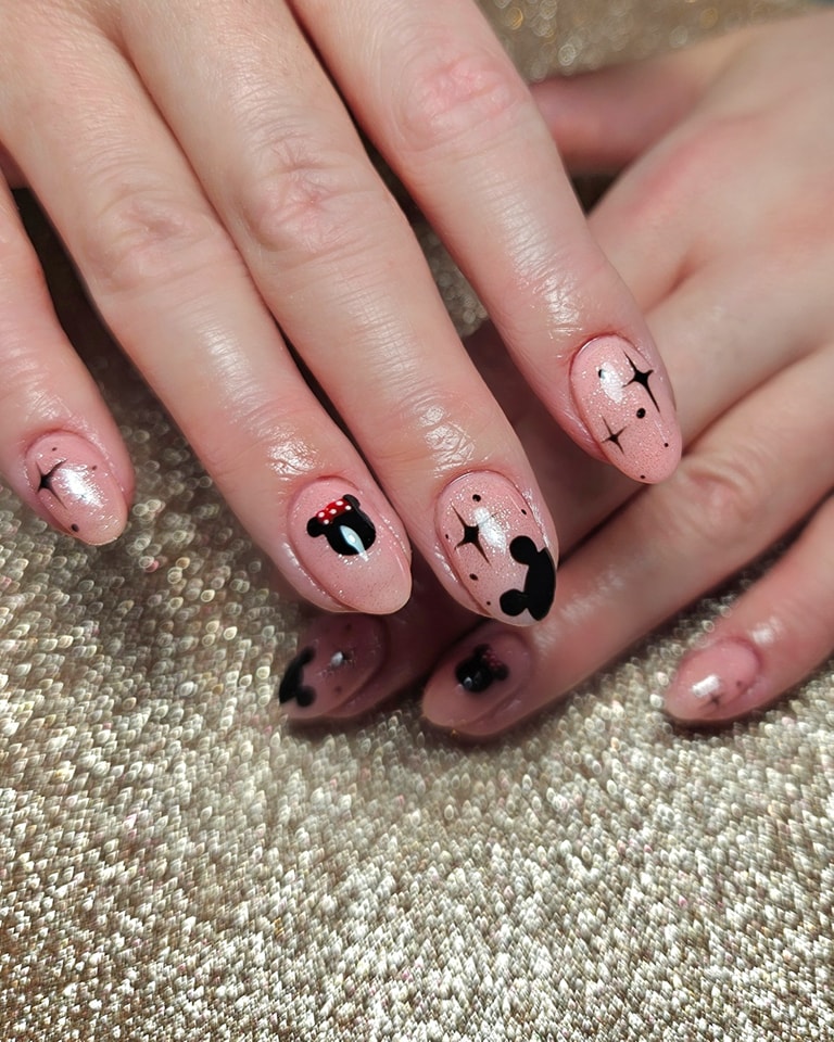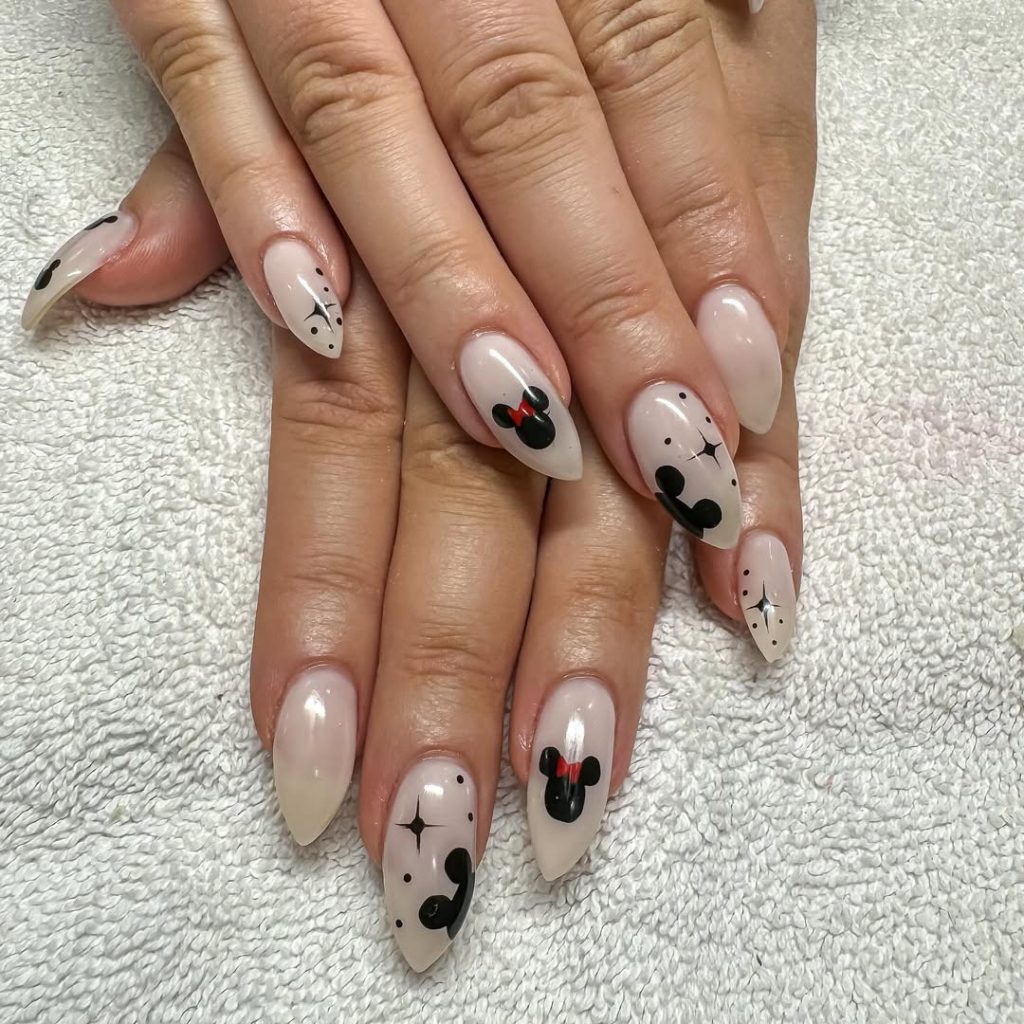 A glossy, Neutral base lays the groundwork for black Mickey silhouettes that float along the cuticle and tips. Two nails add a teeny red bow—an understated Minnie nod—while fine-line “twinkles” and micro-dots keep the look Subtle and graphic. The softly rounded almond shape elongates the fingers without feeling costume-y.