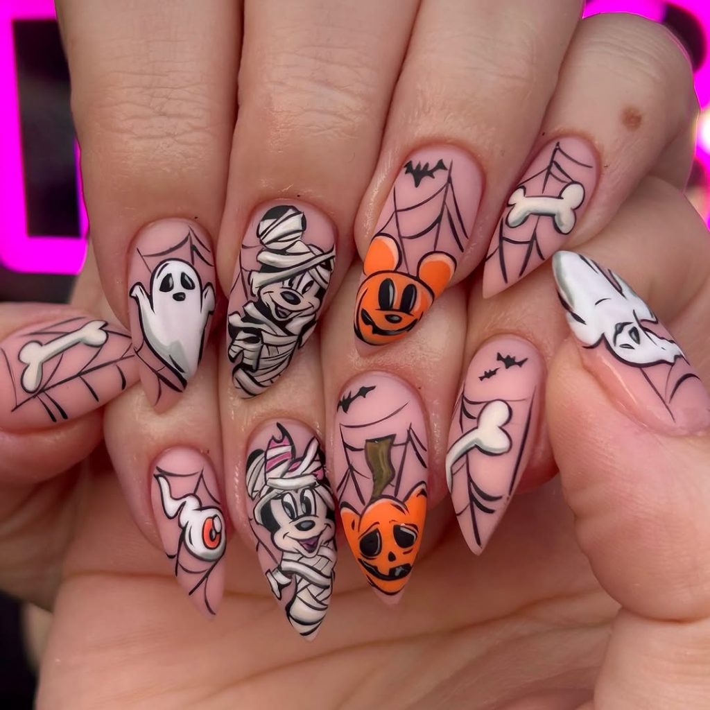 A blush base becomes a full-on tale: mummy-wrapped Mickey and Minnie, floating ghosts, wee bats, candy-orange jack-o’-lanterns, bones strewn about, and webbing sketched in hairline detail. The elongated almond silhouette keeps all that detail refined rather than overwhelming, and the matte topcoat (ask your tech to buff, then seal) adds a comic-book finish.