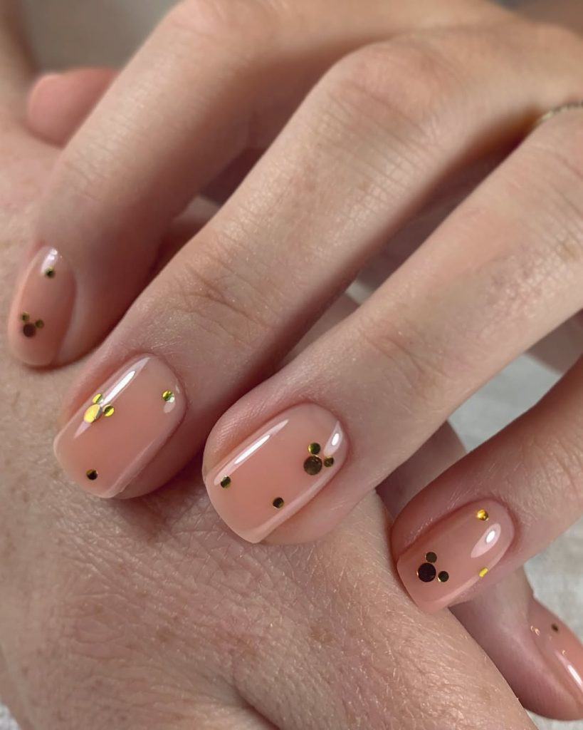 Why it works: Negative space adds breathing room, so the motif feels Simple and grown-up. It’s an Easy request at the salon: a sheer pink-nude gel and dotting.