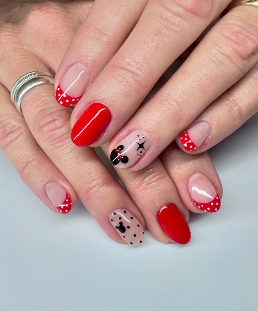 A greatest-hits medley: crisp french tip arcs in Minnie polka dots, glossy Red statement nails, and a nude accent with a tiny bow, twinkle, and micro Mickey. The shape rides the line between oval and squoval for everyday wear.