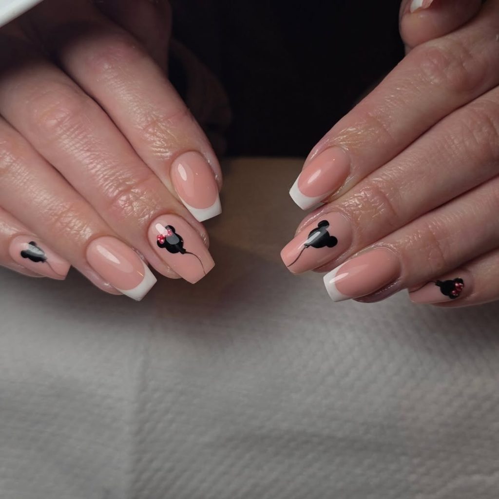 Clean white french tip on a peachy nude base, interrupted by floating black Mickey-balloon silhouettes and a single Minnie bow. The medium length and crisp square edge look tailored—perfect if your HR handbook prefers “subdued” manicures.