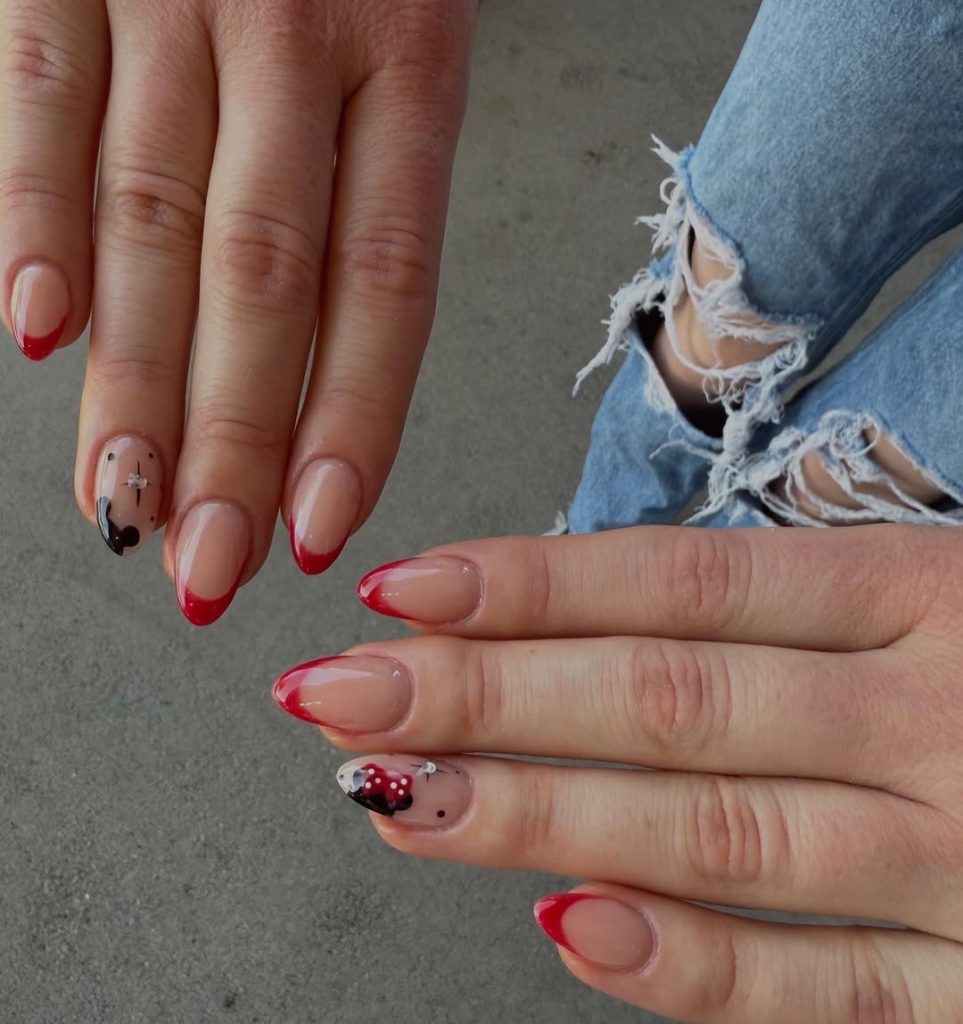 A whisper-thin french tip in cherry Red arcs around sheer nude, punctuated by a tiny Minnie head and stardust dots. The proportion is sleek on mid-length almond nails and just as chic on Short lengths if you’re typing all day.