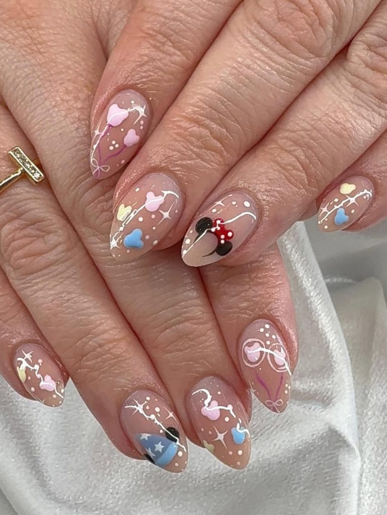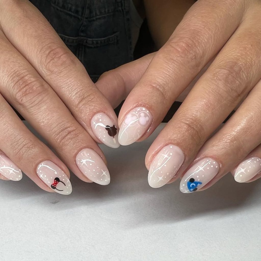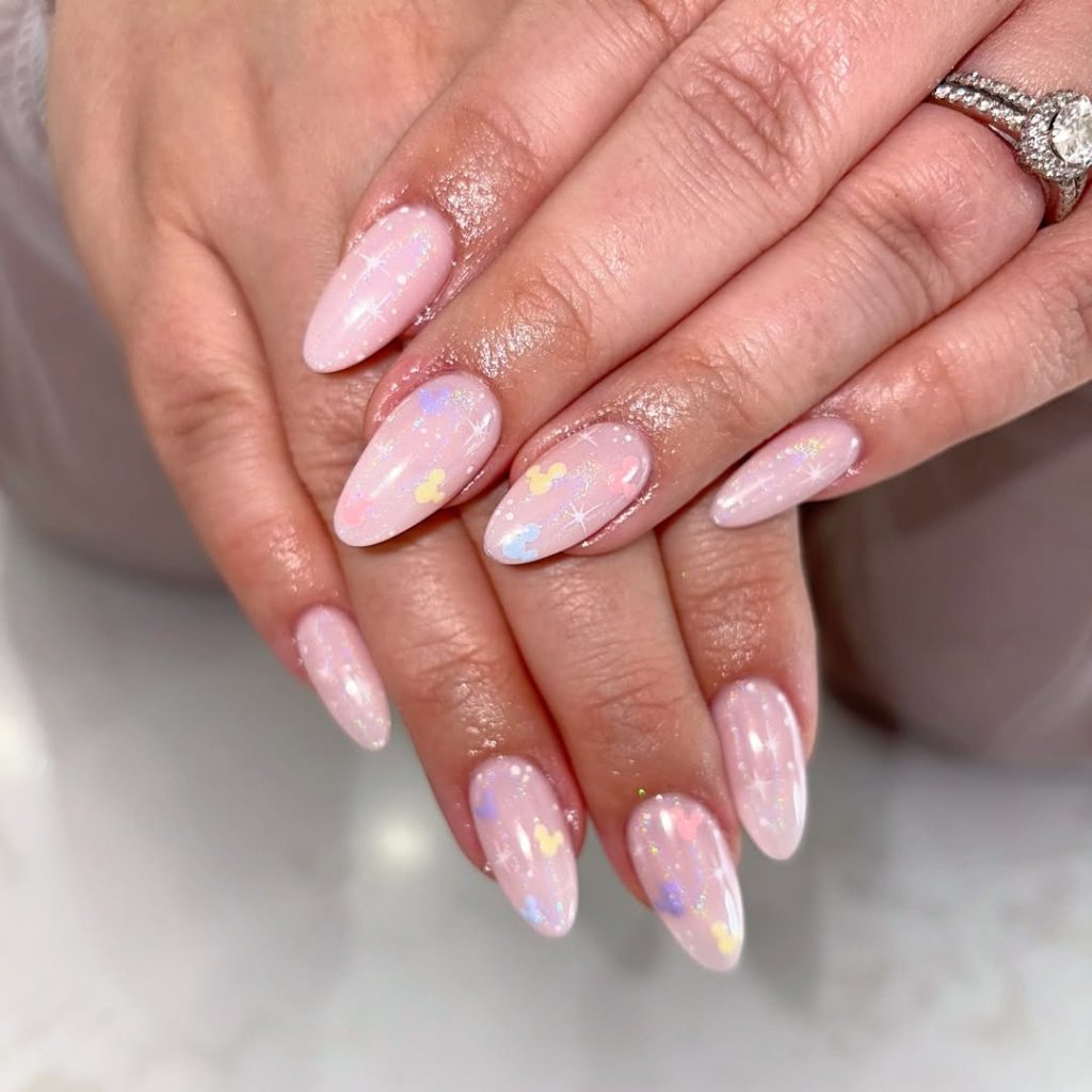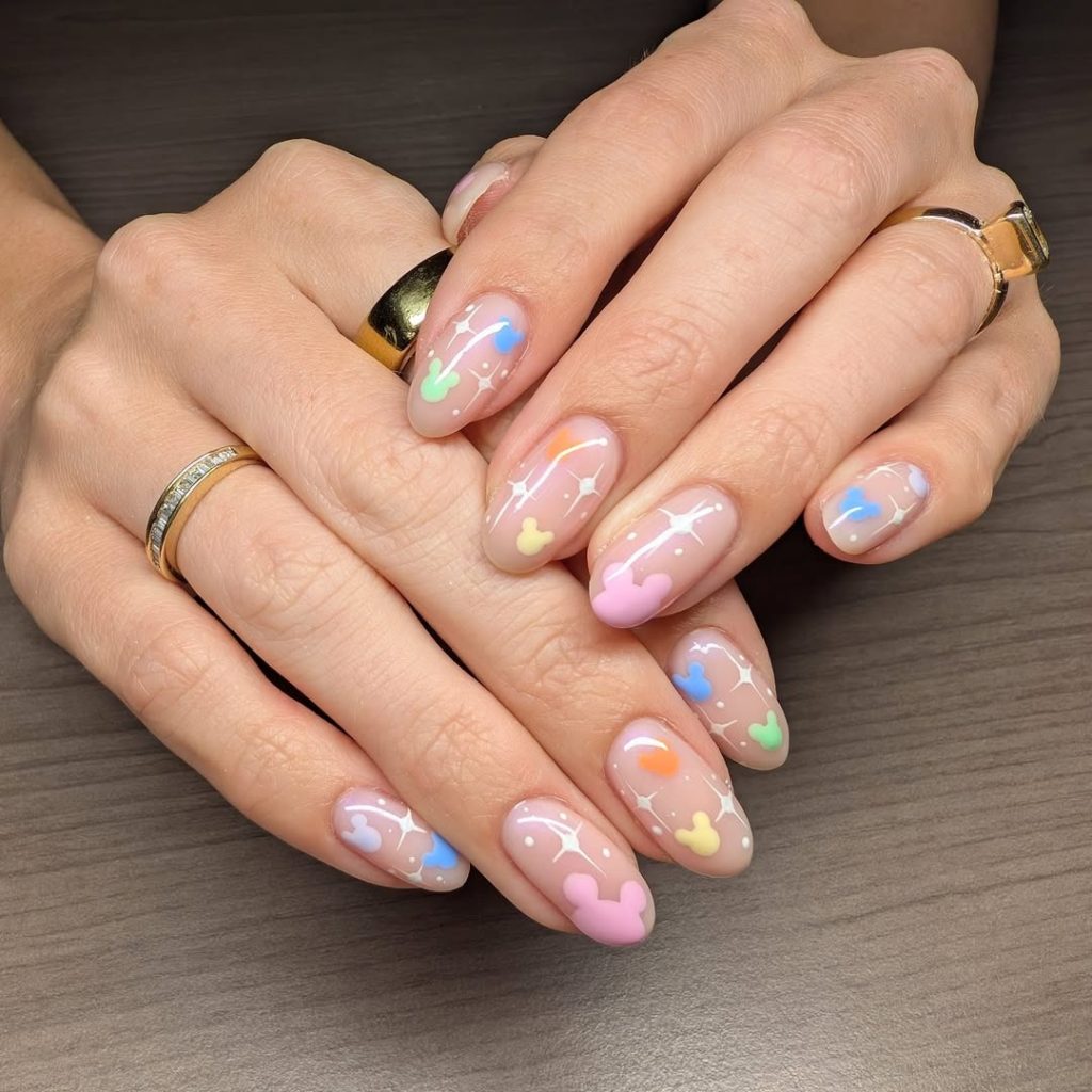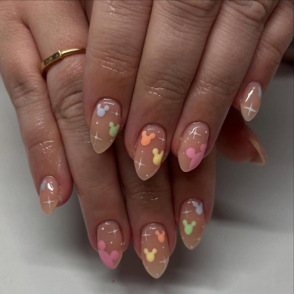 Sheer nude turns into a candy shop with tiny Mickey silhouettes in sherbet pastels—lemon, mint, peach, and lilac—scattered across glossy almond tips. White starbursts add a soft sparkle so the look stays Subtle , not sugary.