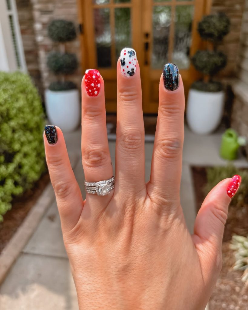 A mixed mani that feels playful and grown-up: glossy red-and-white dots, charcoal glitter, and a white accent stamped with micro Mickeys. The straight sidewalls and softened corners give a chic square profile that photographs beautifully holding a latte or a Lightning Lane.