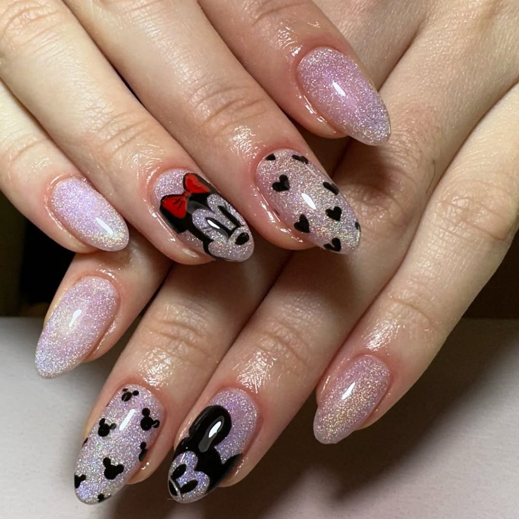 Lavender-silver sparkle across every nail, with two statement moments: Minnie’s portrait with a cherry Red bow and a field of heart-shaped Mickeys. The elongated almond shape turns the glitter into a sleek gradient.