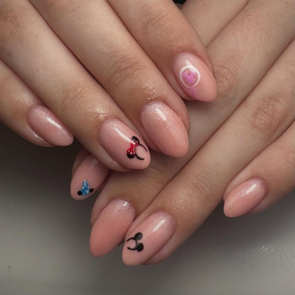 A rosy gel with a whisper of shimmer is dotted with tiny icons—Minnie’s red bow, a classic black silhouette, a pastel pink emblem, and the Sorcerer’s hat in sapphire. The mid-length almond keeps the look graceful while the negative space makes it wonderfully Subtle . If you’re testing the Disney waters in 2026 , this is the “soft launch.”