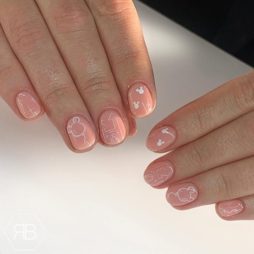 Peach-nude gel on Short nails with crisp white line drawings—tiny Mickey heads, abstract arrows (a clever park-map wink), and starry twinkles. The mini scale is perfect for hands-on days and parent-teacher nights.
