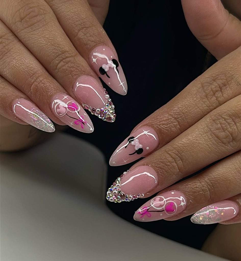 Glossy blush Pink gel meets clear, crystal-encrusted tips and delicate white linework that sketches Mickey balloons and tiny Minnie bows. The elongated almond silhouette keeps the rhinestones refined, not clubby, and the mirrored accents on a couple of nails catch light like jewelry. It’s park-photo gold but polished enough for a cocktail dress.