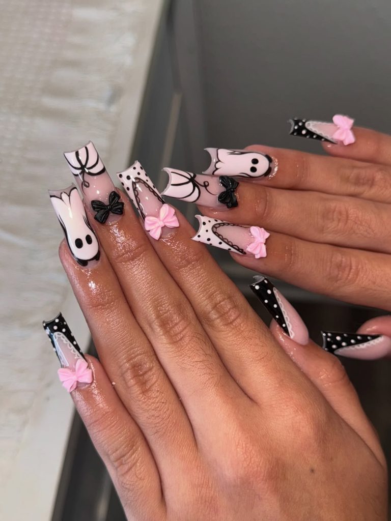 Think Disney-meets-dollhouse: glossy blush bases, black-and-white web panels, peekaboo ghosts, and dotted frames—finished with sculpted 3D bows. The long, straight sidewalls give this a couture square profile, and the dimension screams editorial.