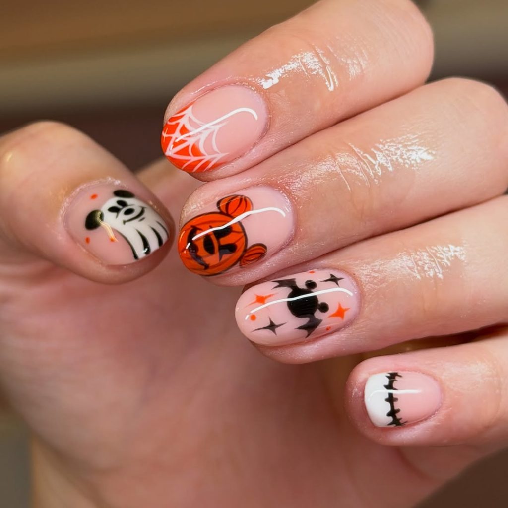 Compact Short nails become a seasonal postcard: a Mickey pumpkin balloon, spiderweb corner, bat-silhouette Mickey, and a stitched French detail—all offset by nude negative space and minuscule orange stars. It’s festive enough for trick-or-treating but subtle for the office.