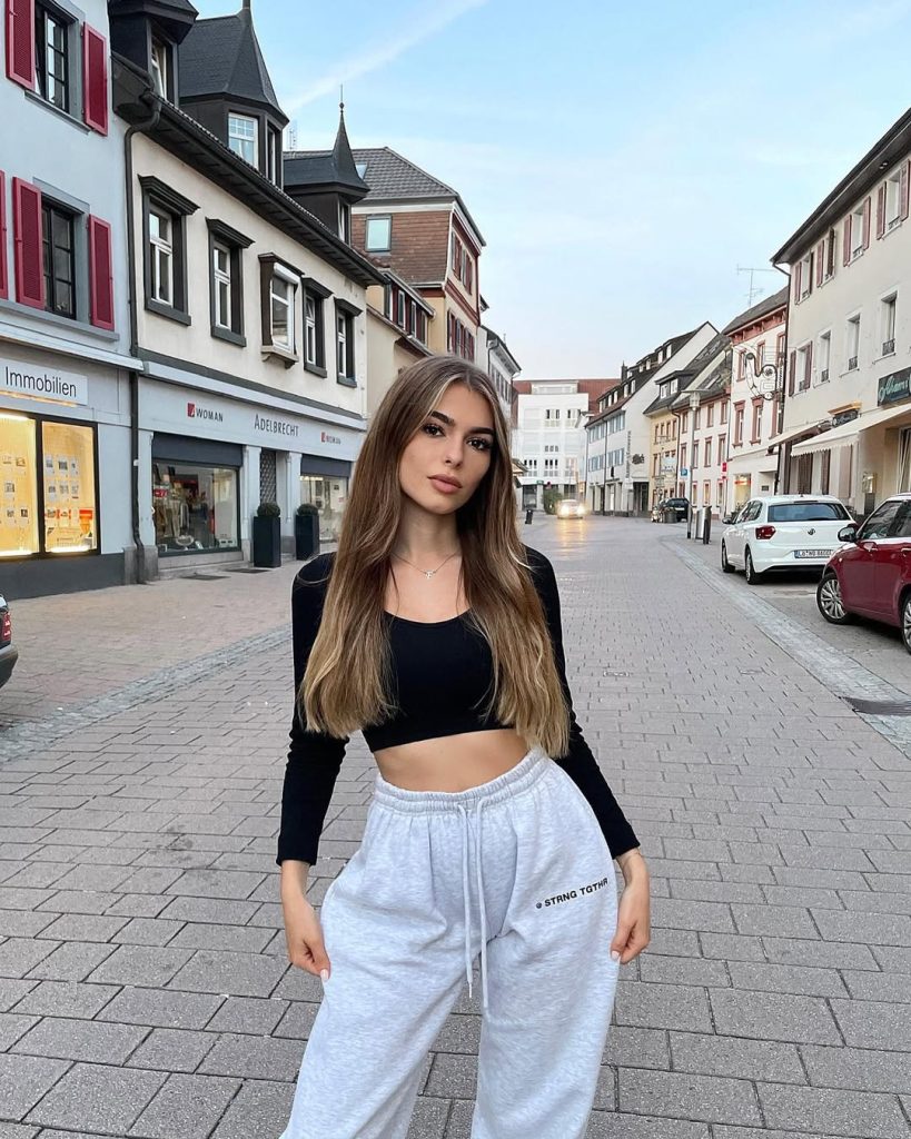 A sleek black crop top meets soft gray sweatpants for a relaxed city look that still feels sharp, youthful, and confidently casual.