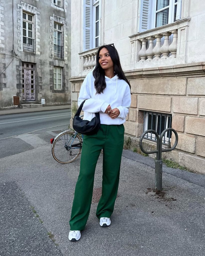 A crisp white hoodie teams up with deep green trousers and white trainers for a sporty yet polished look, ideal for mild spring days.