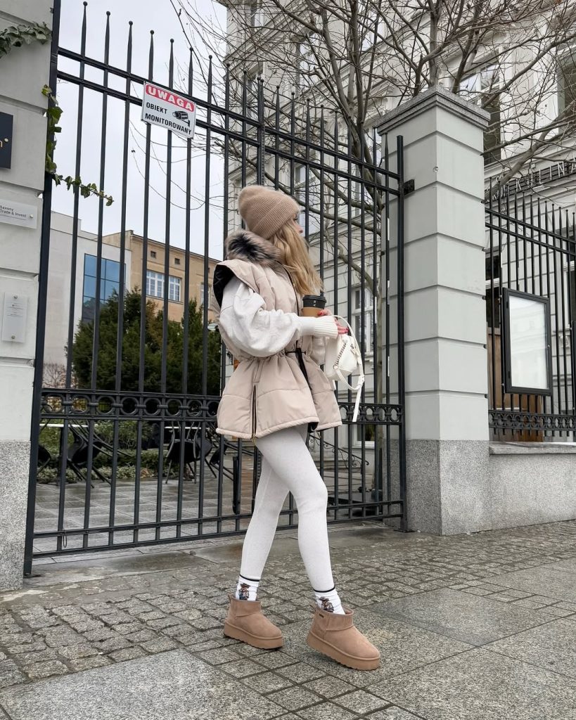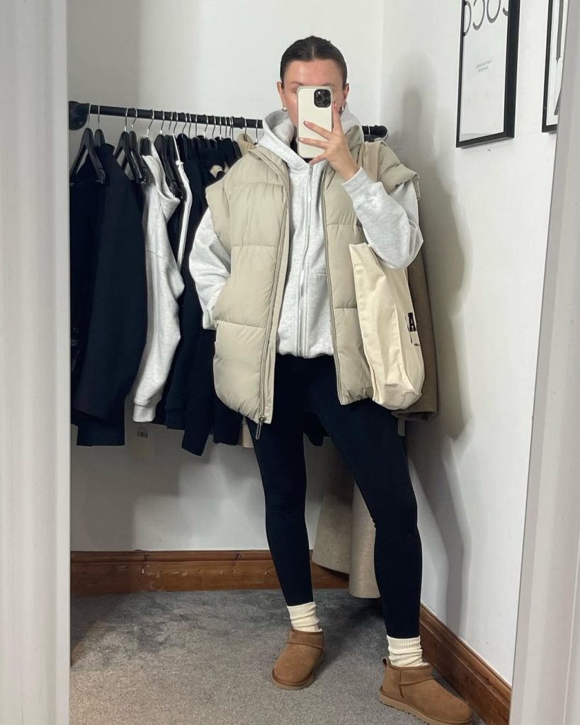 Leggings, a puffer vest, and Mini UGGs