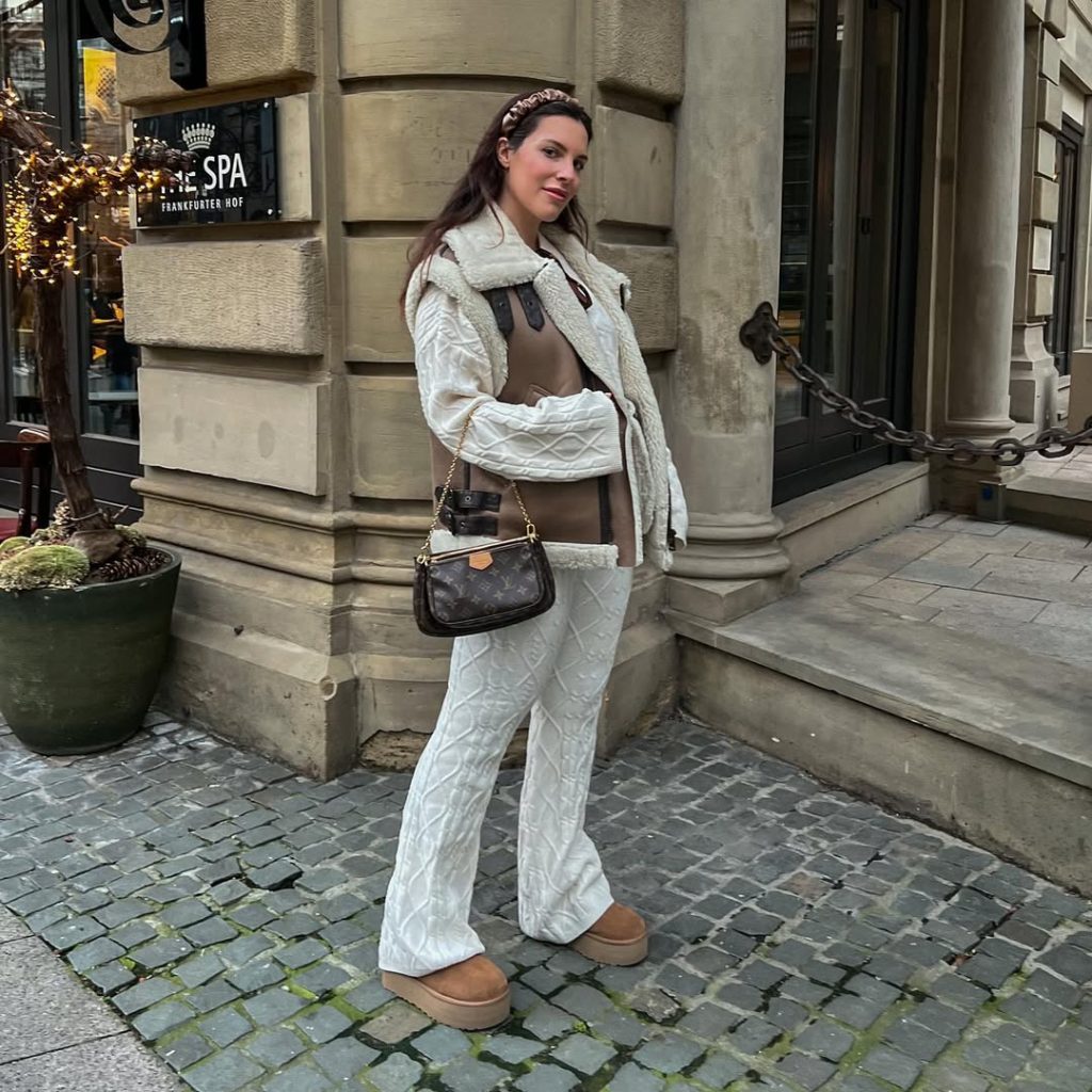 A cream-colored cable-knit set paired with a shearling-lined vest and tan platform boots is a cozy and put-together look that is straight out of luxury loungewear.