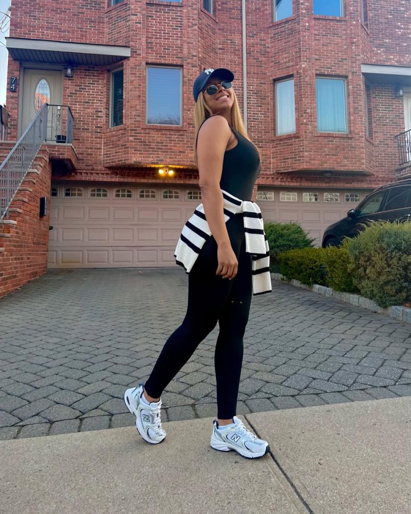 It’s an everyday hero outfit: polished enough to hit up Saturday brunch, relaxed enough to take a long hike around the neighborhoods, and sporty enough to juice Shuffles for a quick dance workout on our driveway. The all-white creates a clean line, while a striped sweater adds enough interest to keep things interesting. This one is obviously suited to summer evenings out, casual concert nights out with friends at the park, and low-key parties when you plan on just chilling out there in your yard. To give this look some personal expression, pick a new color on that striped sweater—navy stripes will get you into more oceanfront vibes, while a pastel sweater gives you a more chill vibe. A belt bag, which you wear across your body, will keep your hands free to keep on moving! I wouldn’t pair it with chunky jewelry accessories and dressy handbags—this look is about feeling ready to roll out at a moment’s notice. This is a whole easy look for Blackwomen into sportswear—keeping things simple enough to play up bold braided hairstyles, bold curls, and bold lip colors! Oh, and it’s spring!