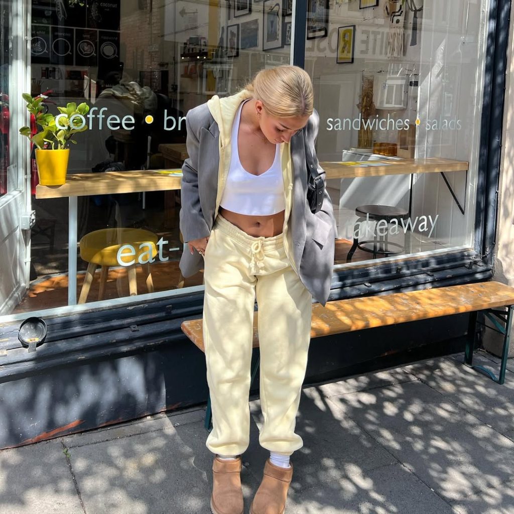 Soft butter-yellow joggers and a matching hoodie are elevated with a sharp gray blazer and tan ankle boots, creating a playful mix of lounge and tailoring.