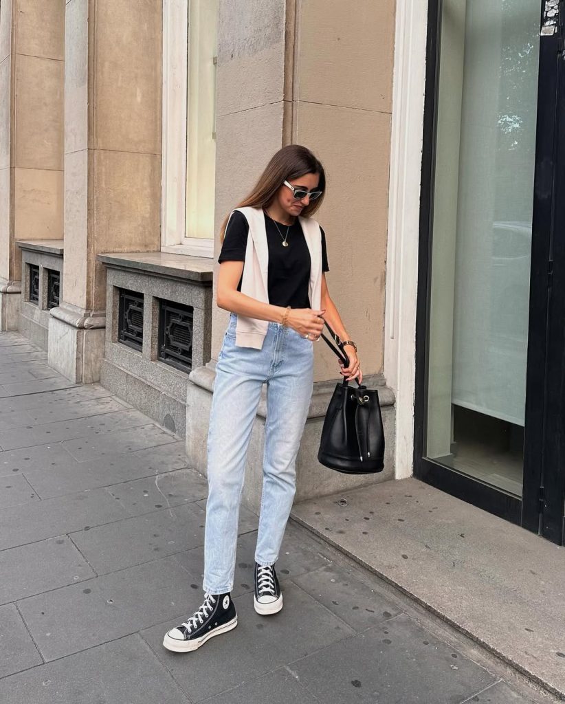 This combination is an effortless uniform for school, summer, weekend museum visits, or grabbing coffee between errands. The jeans and Converse keep things youthful, while the vest and bucket bag add just enough structure to feel grown-up. To personalize it, swap the vest for a striped cardigan or add a silk scarf tied to the bag. I’d skip overly formal heels or heavy statement jewelry here; the charm lies in how simple and effortless the outfit feels.