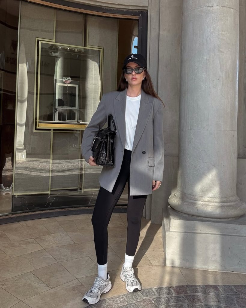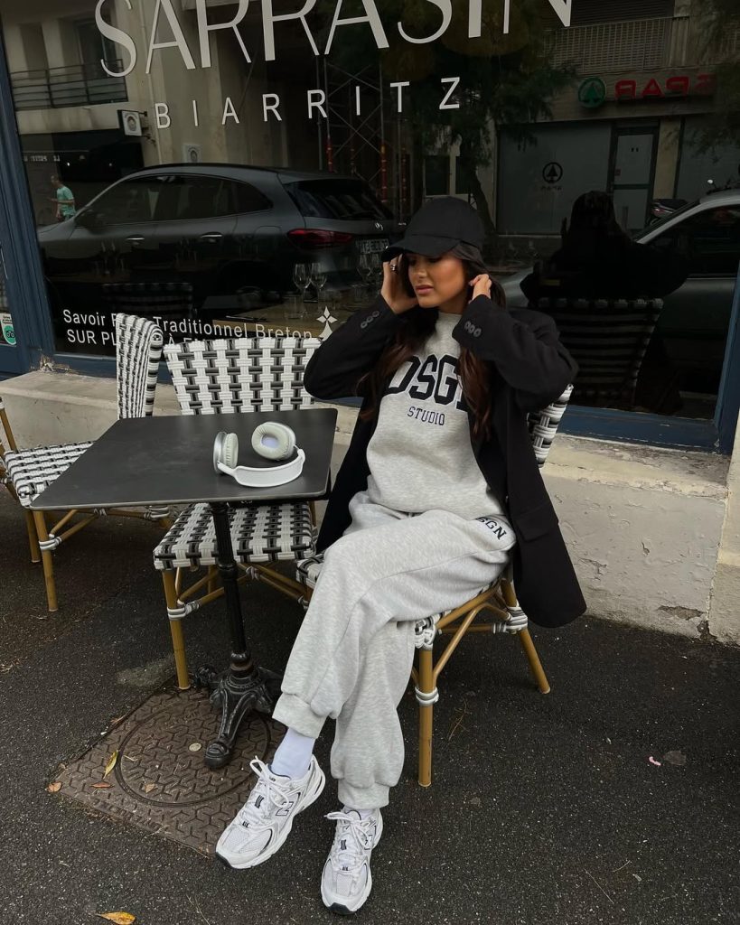 A heather grey tracksuit paired with a sharp black blazer and cap emits this “coffee break between meetings” vibe—practical and ready to hit work or a casual meet-up.