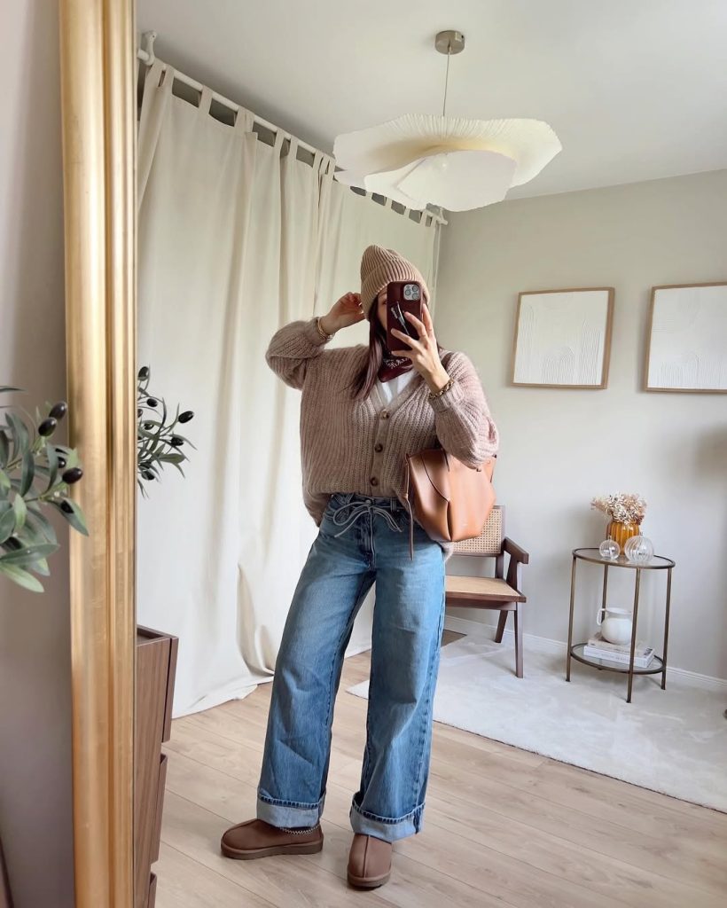 Knit Cardigan and Wide Jeans Indoors