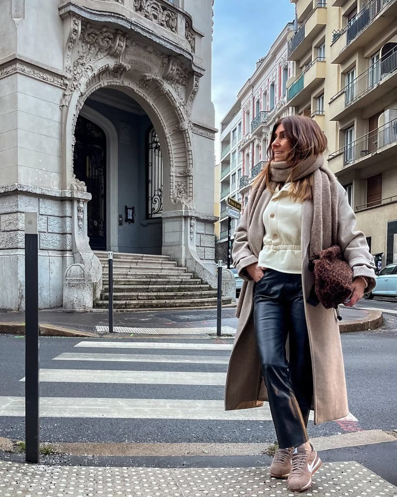 This look works beautifully for sightseeing, relaxed workdays, or winter trips where you’re walking a lot but still want to look put-together. The sneakers keep it grounded and practical, while the leather trousers add edge. To personalize, try swapping the scarf for a rich burgundy or forest green version. I’d skip very delicate heels or tiny clutches; the architecture of the outfit comes from its substantial layers and textures, which pair best with equally substantial accessories.