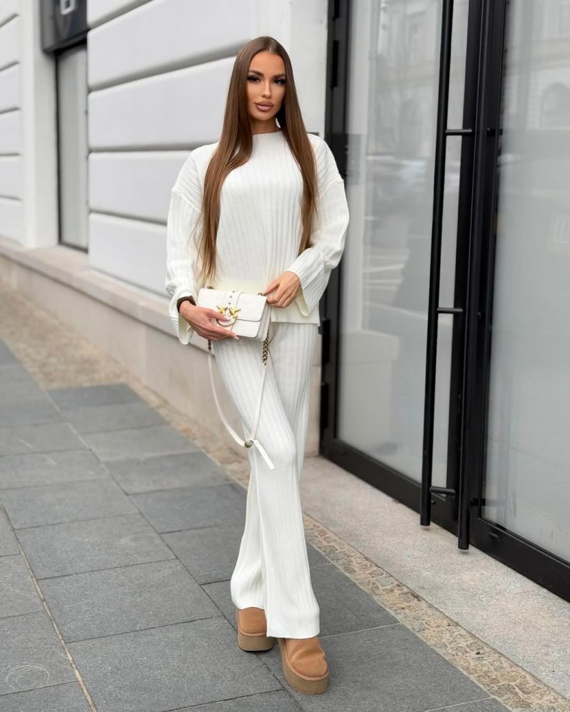 A cream ribbed knit set with tan platforms offers a polished, monochrome answer to Comfy Outfit Ideas 2026, bridging lounge and street style.