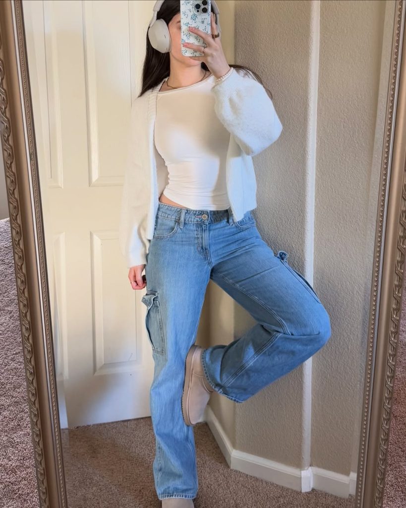 A cream buttoned shirt, fluffy cardigan, and relaxed cargo jeans make up a casual, quietly cute combination that is simply perfect for music-filled days at home.