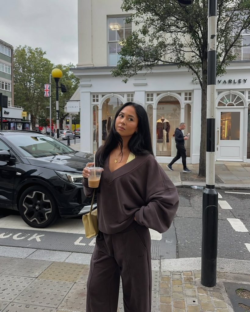 An oversized cocoa sweat set layered over a lime sports bra brings cozy street-style energy, ideal for casual coffee runs and lazy city wanders.