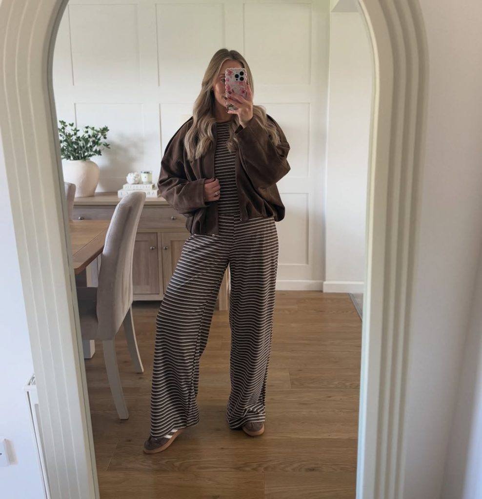 This outfit is perfect for hosting friends at home, movie marathons, or a relaxed fall dinner with candlelight and charcuterie. The stripes add visual interest without sacrificing comfort, and the jacket makes it feel intentional rather than PJ-like. To switch it up, trade the slippers for white sneakers and add a tote, turning it into a grocery or school-run look. Avoid clashing prints or super-bright colors; the quiet palette is what keeps the set feeling chic rather than loud.