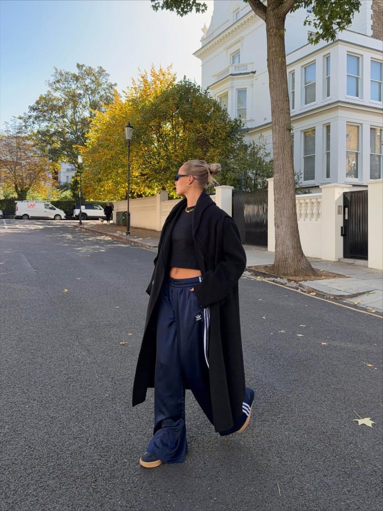 A long black coat, cropped top, and poodled Adidas track pants make a sporty-meets-tailored look that’s surprisingly comfy for city days.