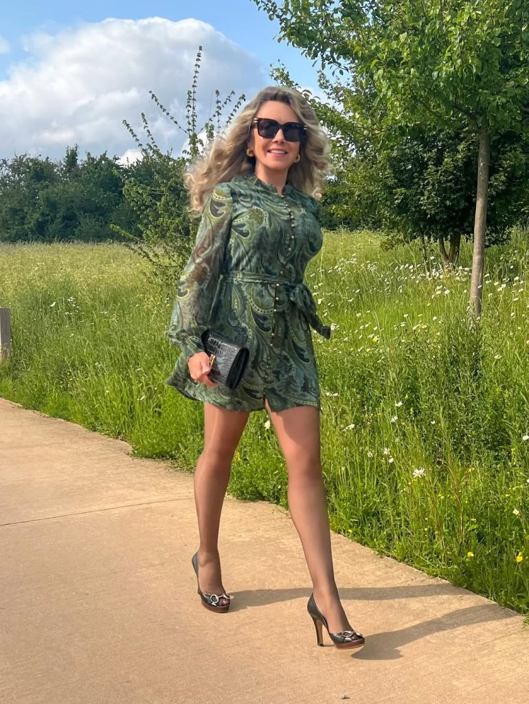 - Belted paisley mini dress in muted green tones with sheer sleeves