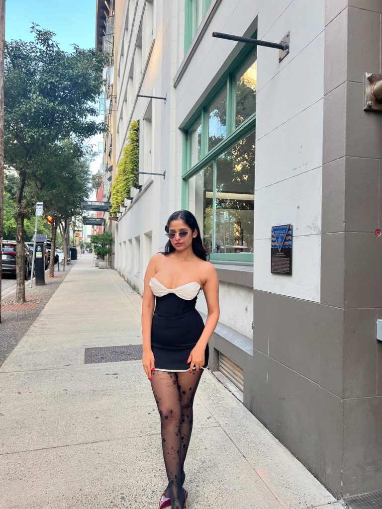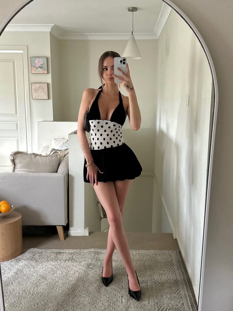 This look is made for late-night lounges, bachelorette parties, or edgy after-parties in 2026. It’s undeniably bold, but the clean color palette keeps it from tipping into costume. To soften it slightly, add a tailored blazer or long coat in camel or blue; for full drama, pair with a sharp red lip. Avoid big bags or sneakers; this outfit is all about the lines, and the shoes are as important as the dress.