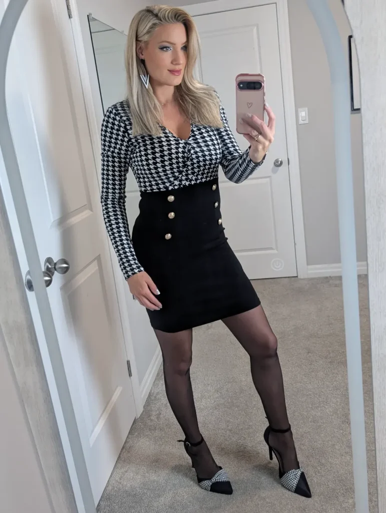 A fitted houndstooth top and high-waisted black skirt with gold buttons turn tights into a boardroom-to-bar essential that feels polished but not stiff.