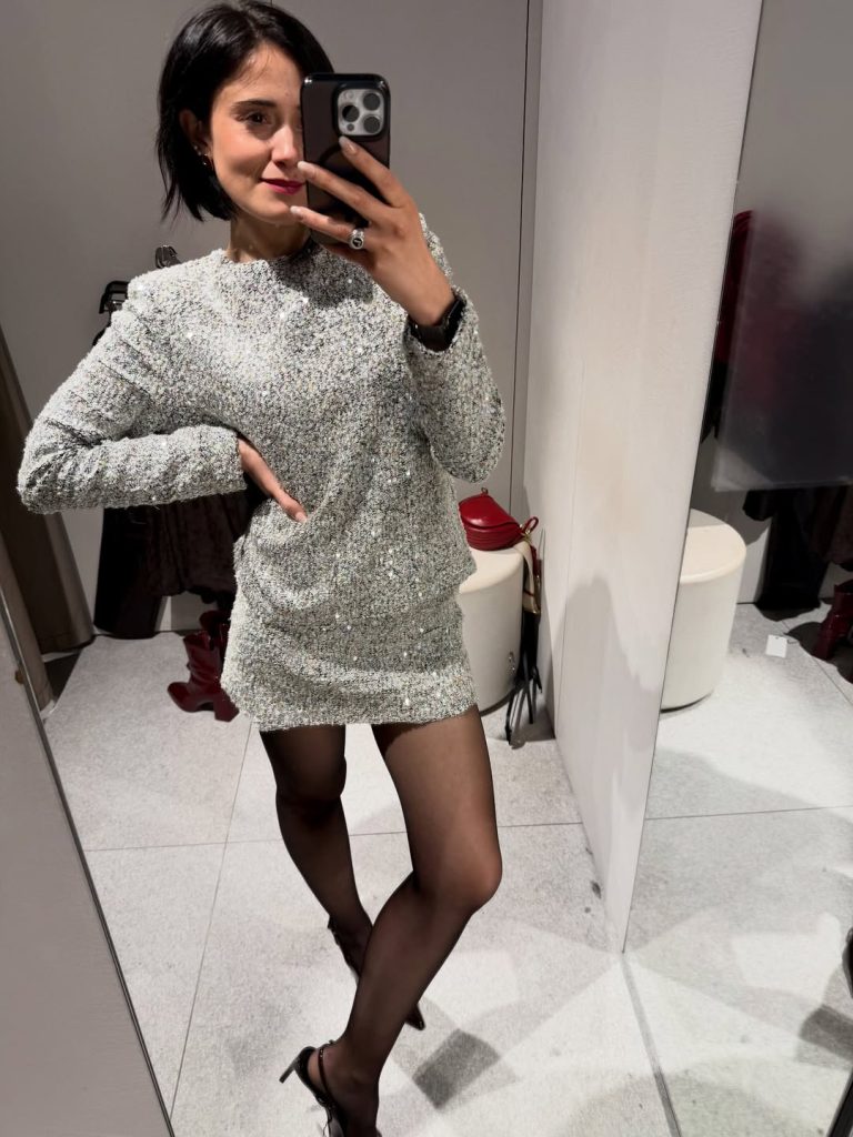 The gold long-sleeve, sequin-tweed, and mini dress alongside some sheer tights provides festive, flattering, and ready-for-all-holiday-invites even in 2026.