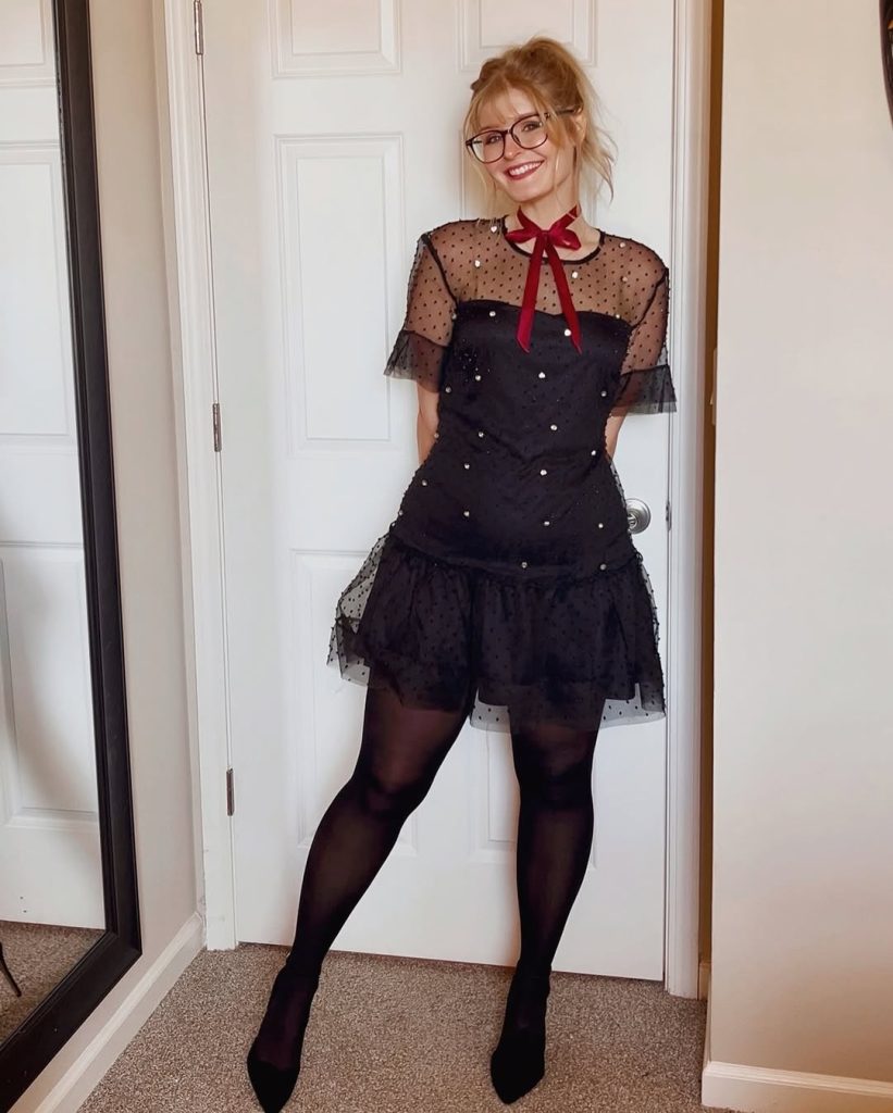 - Sheer Black tights keeping the look cohesive