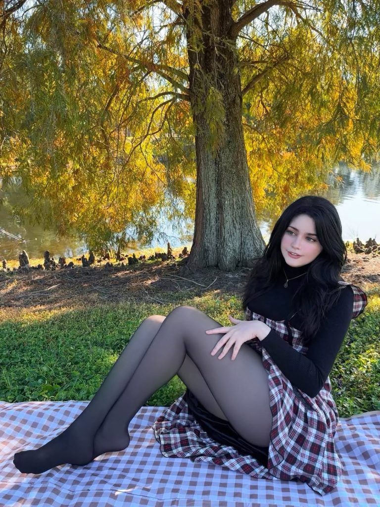 Soft plaid, a fitted black turtleneck, and sheer tights turn a simple picnic moment into a dreamy, storybook casual outfit for crisp days.