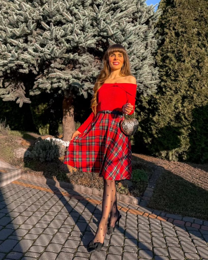 Picture this for Christmas markets, festive brunches, or church concerts where you still want to feel playful. The vertical lines of the skirt and monochrome tights lengthen the legs, which flattered me more than expected when I tried something similar last year. Add a tailored coat for winter, but keep patterns simple so they don’t clash with the tartan. A bright red lip is a must; sneakers are not—the romance comes from the heel.