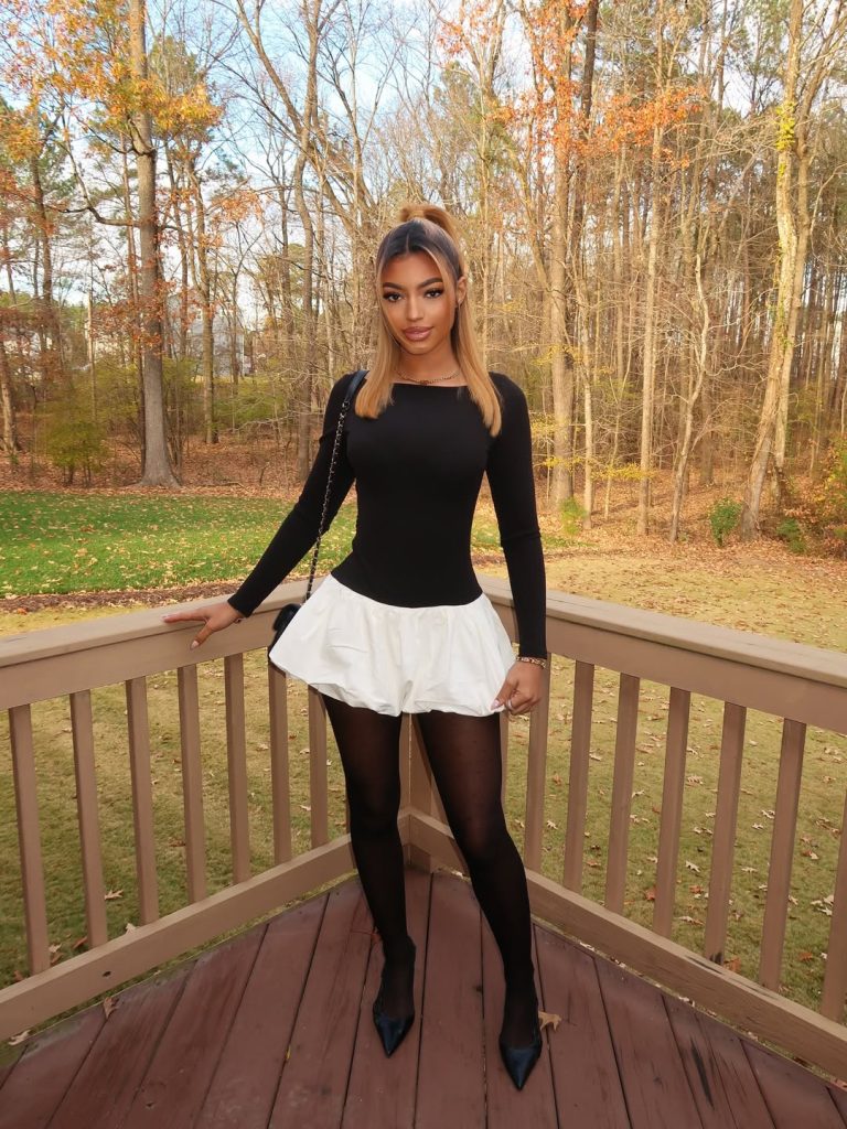 This is a great blueprint for holiday house parties, birthday dinners, or photo-heavy gatherings. The contrast works beautifully on Black women and lighter skin tones alike, making it a versatile styling trick. Add a red manicure or pink gloss for color; if you want to wear it to work, simply swap the bubble skirt for a tailored option of similar length. I’d avoid patterned tights here—the clean blocks of black and white are the whole story.