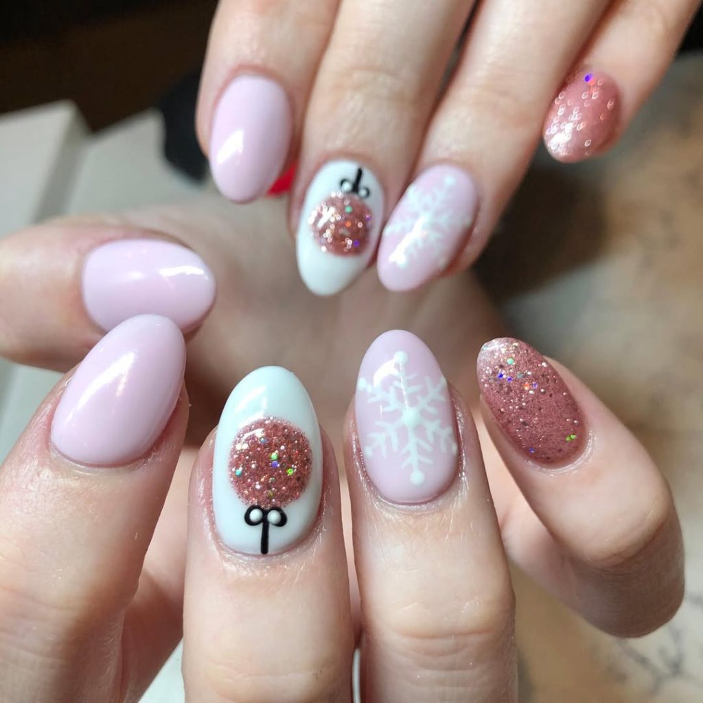A whisper-soft Pink base with rose-gold glitter “baubles,” crisp white snowflakes, and a slick topcoat. The silhouette is Short almond —universally flattering and camera-friendly for all those holiday photos.