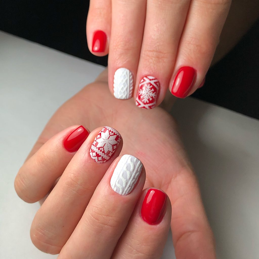 A modern classic: glossy Red on the majority of nails complemented with two snowy accents—one having the raised cable-knit (the sweater-nail everyone’s pinning) and the other with a Fair Isle snowflake. The shape is softly rounded and purposefully Short so it looks polished everywhere yet ready to party. The 3-D knit effect likes a Gel topcoat to maintain the texture clear.