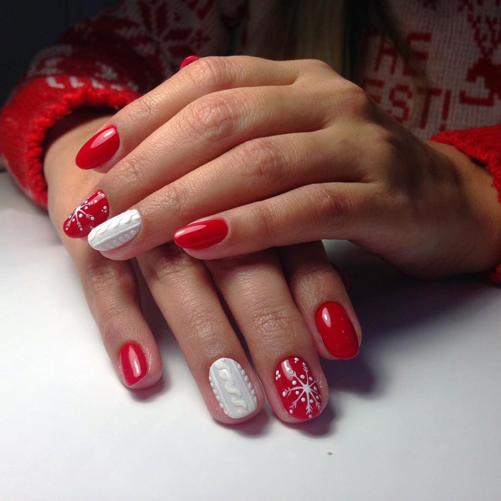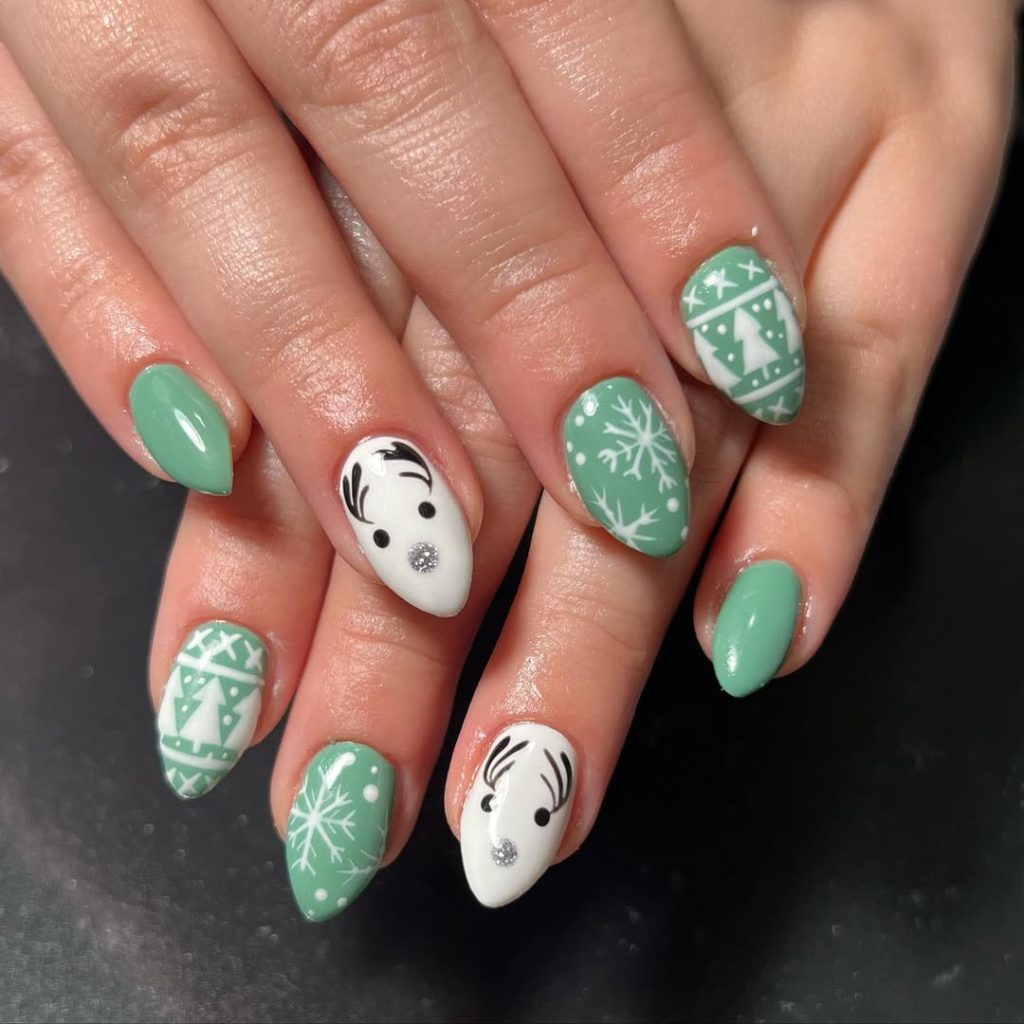 Soft mint and snow-white alternate across medium almonds, mixing Nordic sweater motifs with sparkling-nose reindeer and delicate snowflakes. It’s cozy après-ski energy without leaving town—a perfect nod to the knitwear trend dominating 2025 .