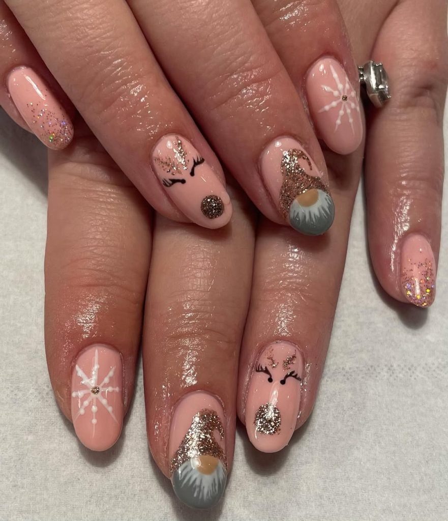 A sheer nude base dusted with champagne glitter, plus character Art —a sleepy-eyed reindeer and a gnome cap—balanced by white starbursts. Length stays comfortably Short with rounded edges for a soft, feminine feel.