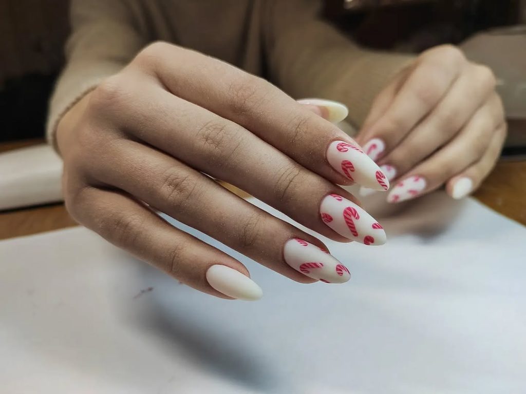 Soft-white, matte Almond tips sprinkled with tiny red candy canes—festive yet Simple enough for office days. The length reads medium, elongating fingers without tipping into Long territory. Ask your tech for a velvet-matte Gel topcoat so the peppermint stamps stay crisp.