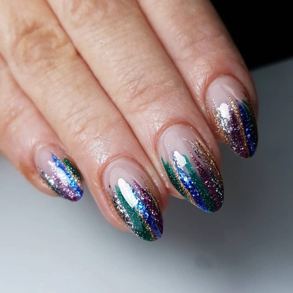 Shimmering strokes of sapphire, emerald, amethyst, and gold cascade from the cuticle on a sheer base. The shape is Short almond , which makes the multi-color sparkle feel chic rather than chaotic. It’s a grown-up take on rainbow lights—think Rockefeller Center, but wearable.