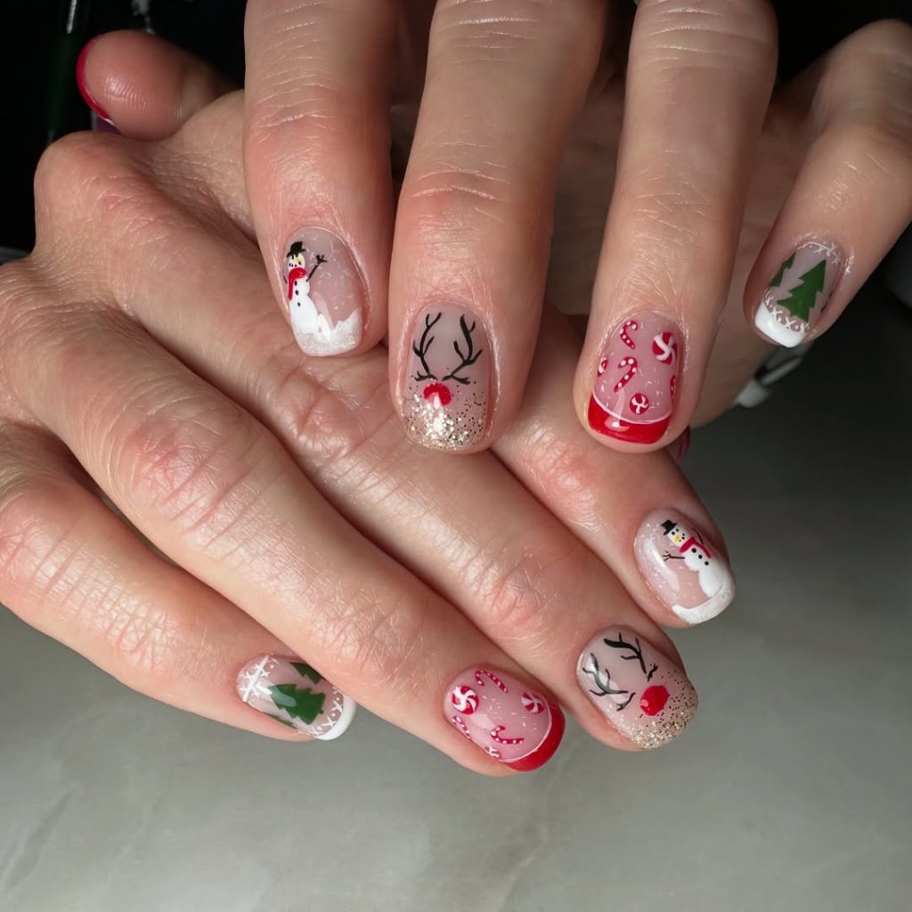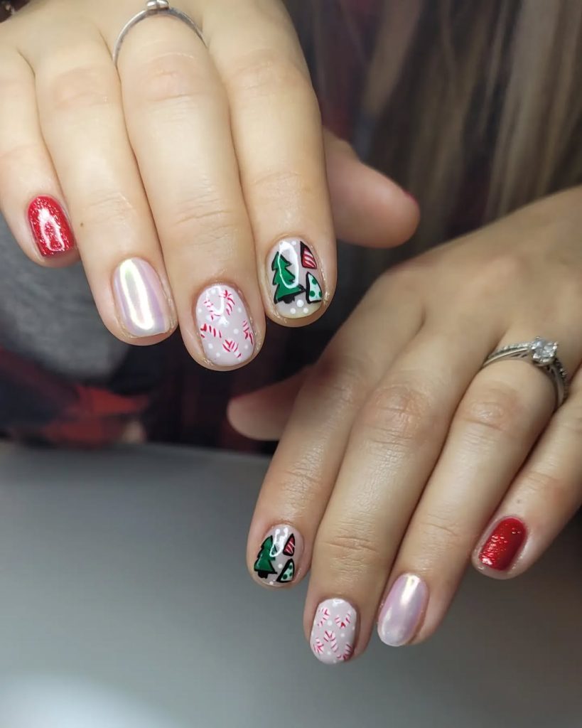 A pragmatic, Short oval set that blends pearl-chrome blush, micro-glitter Red , mini candy-cane stripes, and hand-painted evergreens. It’s merry without being matchy—perfect for moms juggling recitals and Secret Santa.