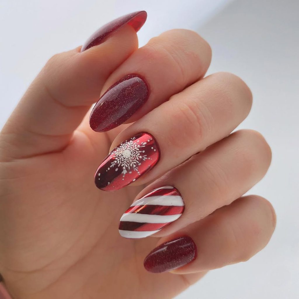 Cranberry Gel glows across most nails, punctuated by a detailed snowflake on a scarlet panel and a candy-cane stripe accent. The silhouette is tapered Almond , polished enough for black-tie yet relaxed for cookie swaps.