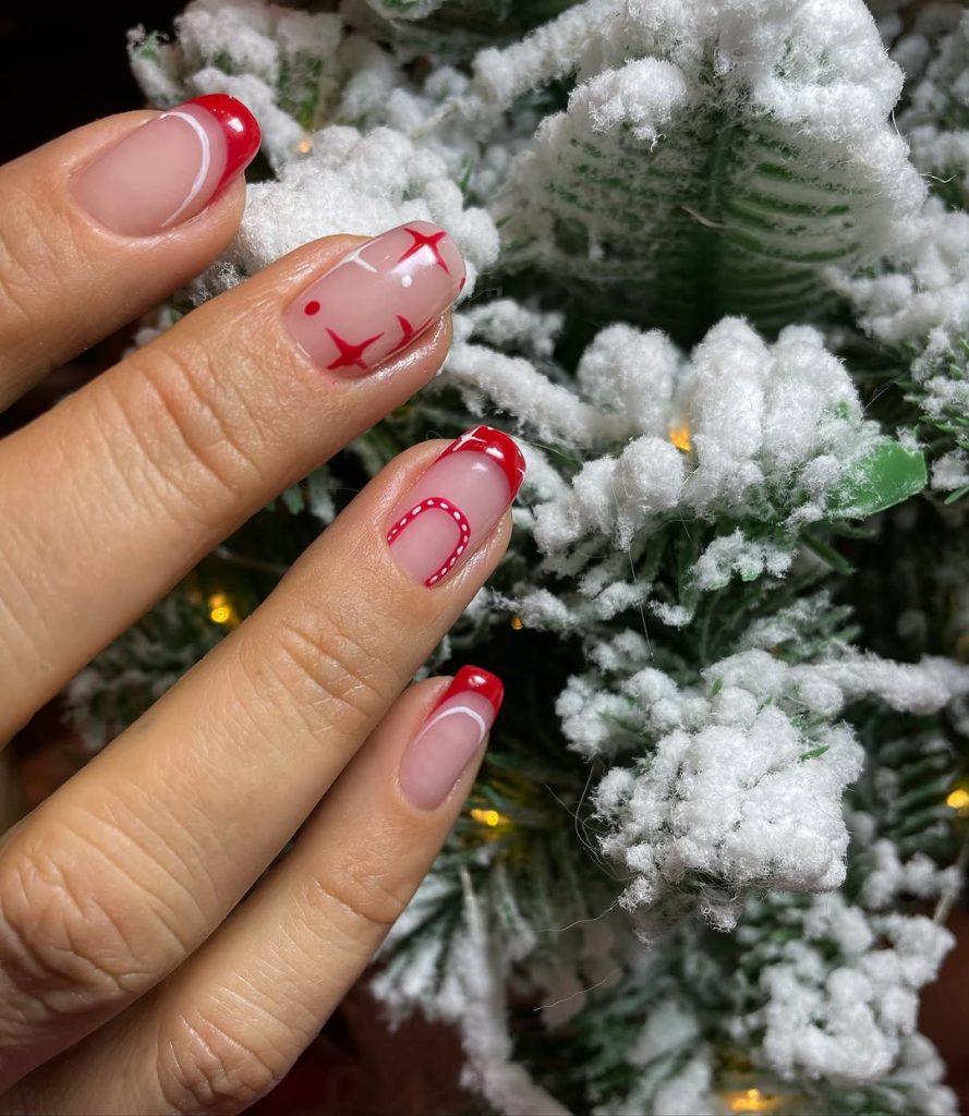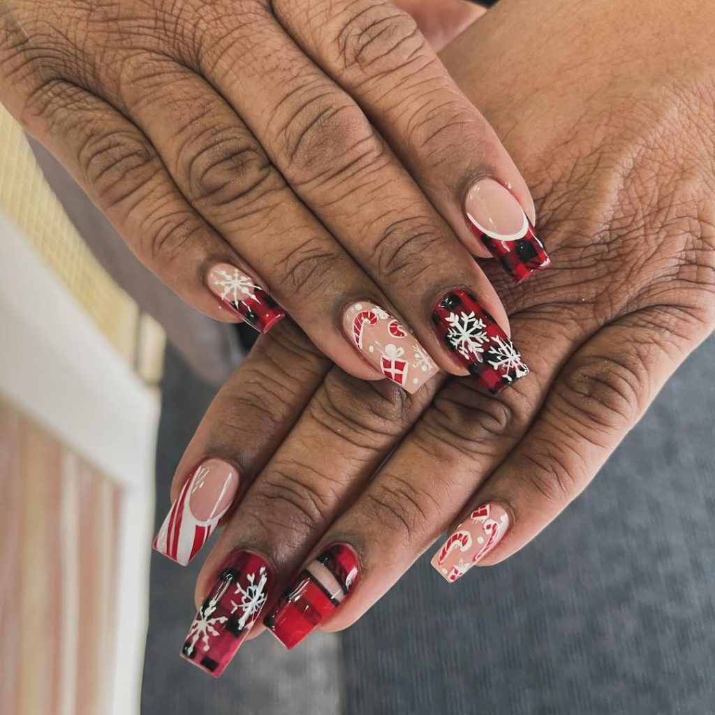 If you love statement nails, here’s your moment: Long Square tips in a red-and-black buffalo plaid, white snowflakes, French swoops, and candy canes layered over soft nude. The symmetry screams salon-perfect and photographs like a dream at every party.