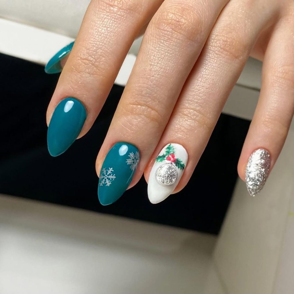 A sophisticated teal—hello, deep Green trend—paired with delicate snowflakes, a snowy-white ornament accented by holly, and a full silver-glitter pinky. The almond length feels elegant without going Long .