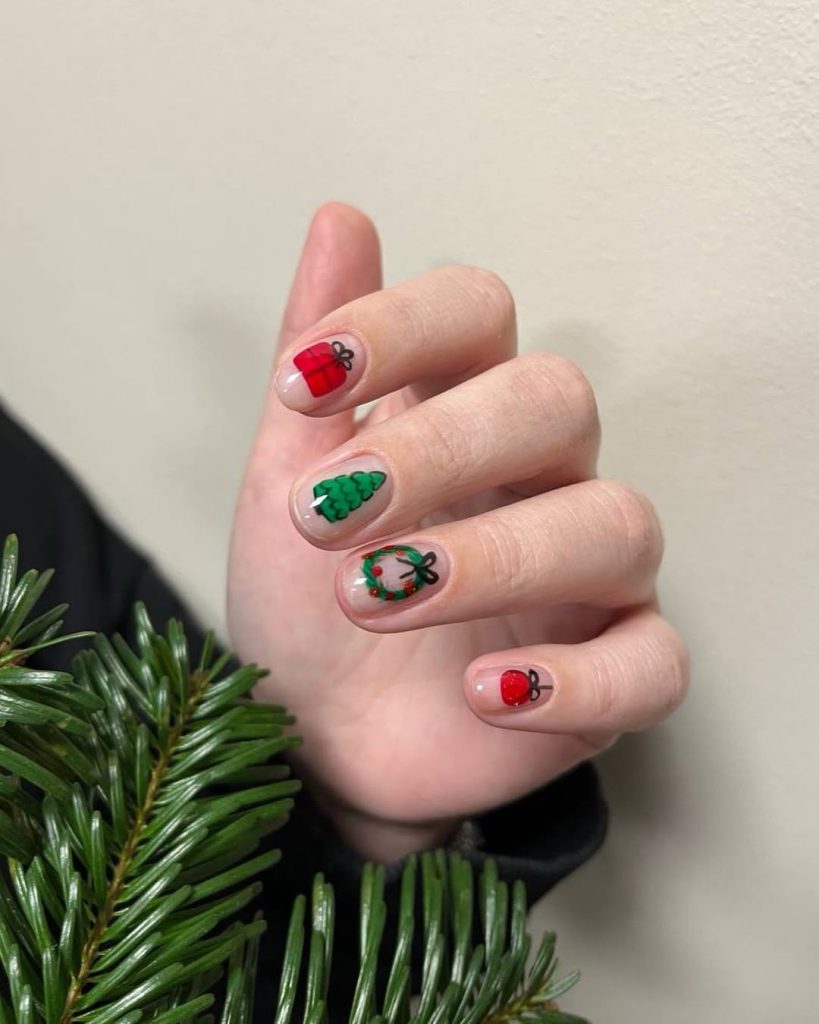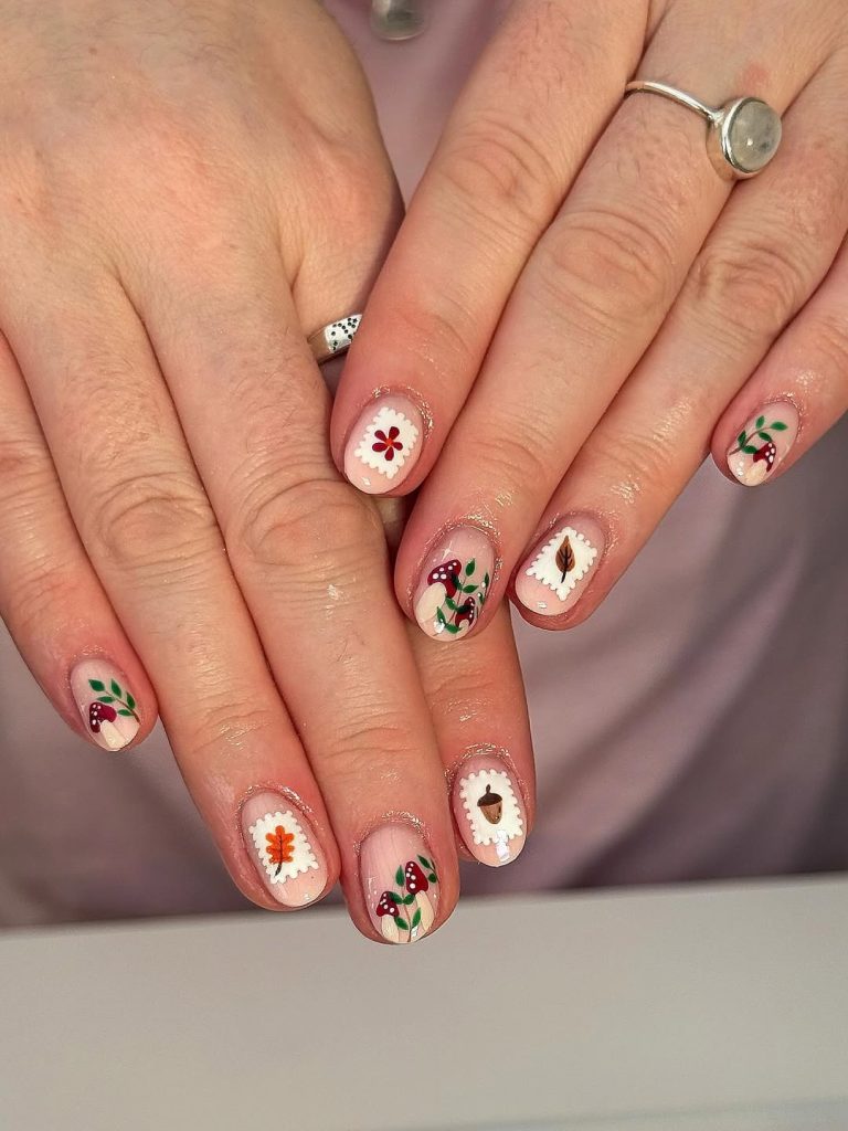Prefer something quieter than candy-cane stripes? This set leans woodland with tiny stamps—acorn, leaf, floral sprig, and toadstool—framed by scalloped edges on a sheer base. The nails are intentionally Short , ideal for busy weeks and a subtle nod to festive greens and reds without going literal.
