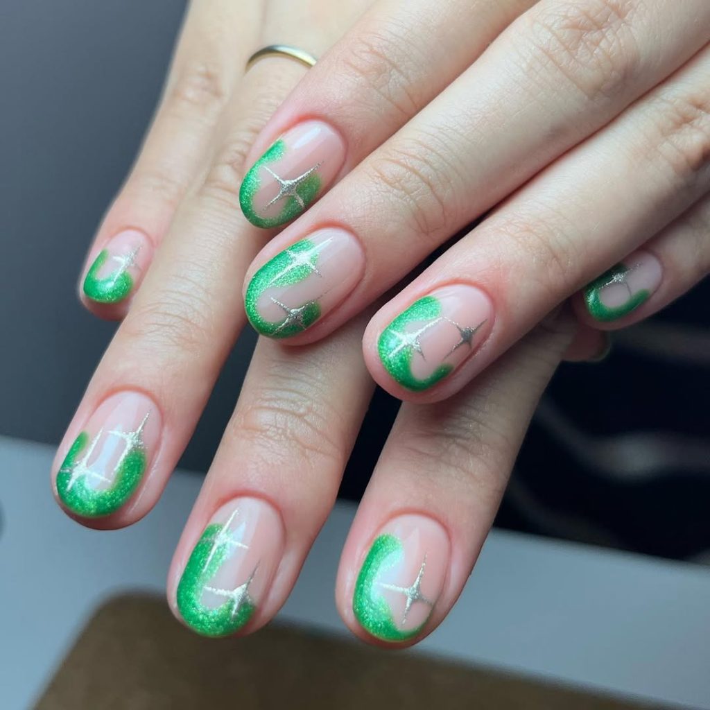 Shimmery lime- Green chrome sweeps along the tips in curved French swirls, punctuated by tiny silver starbursts. The soft oval length sits in that sweet spot between Designs short and office-ready glam.